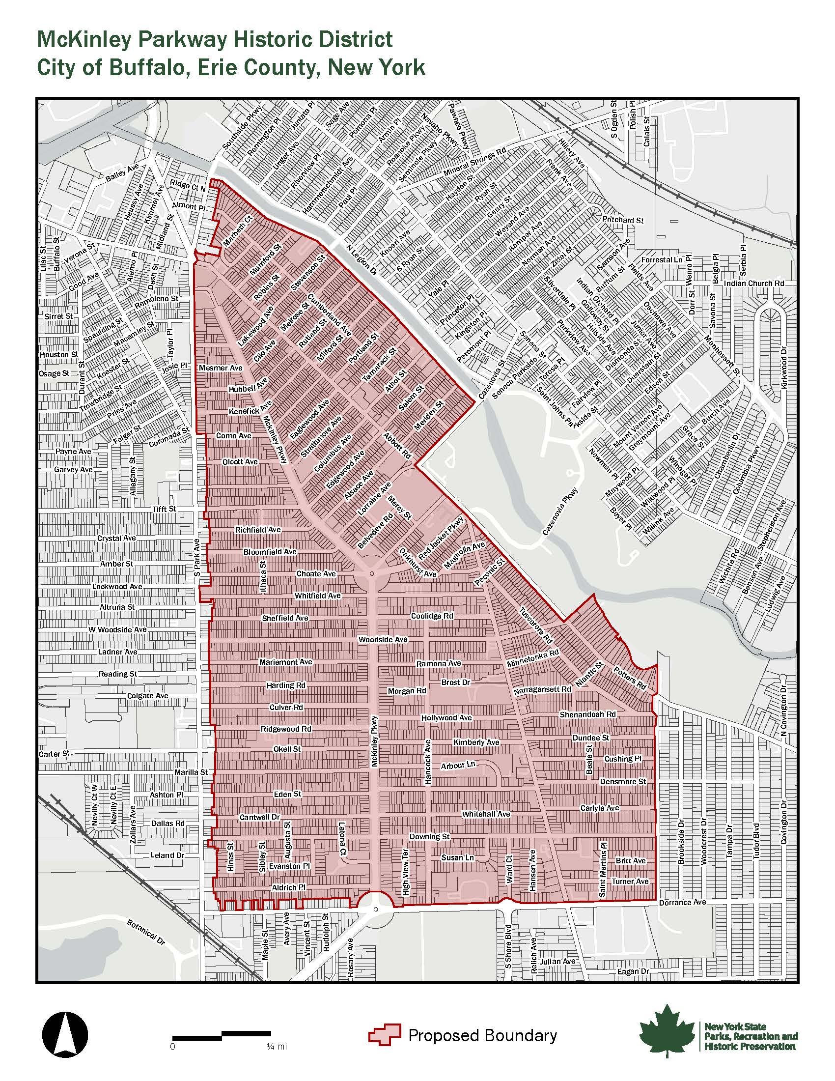 Listed on the National Register of Historic Places in 2025, the McKinley Parkway Historic District is now the largest historic district in New York State. The designation encompasses approximately 5,300 properties in South Buffalo, many of which are private homes, some dating back to 1890. The McKinley district is a large, primarily residential street-car suburb in South Buffalo that contains a collection of largely intact, historically-related suburban subdevelopments, which were established in multiple waves and locations by multiple developers, with a period of significance from 1890 to 1968.